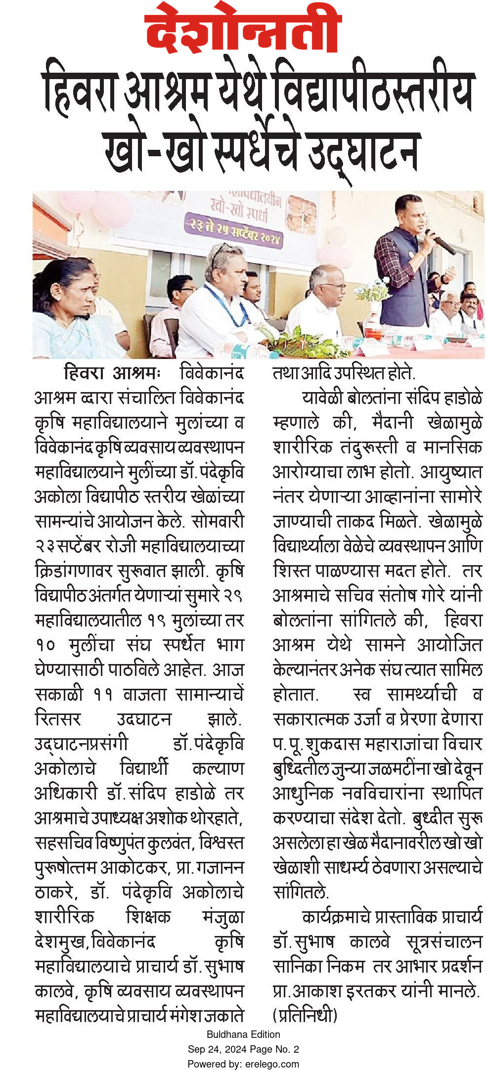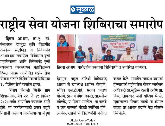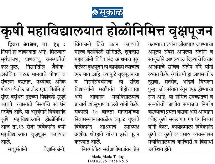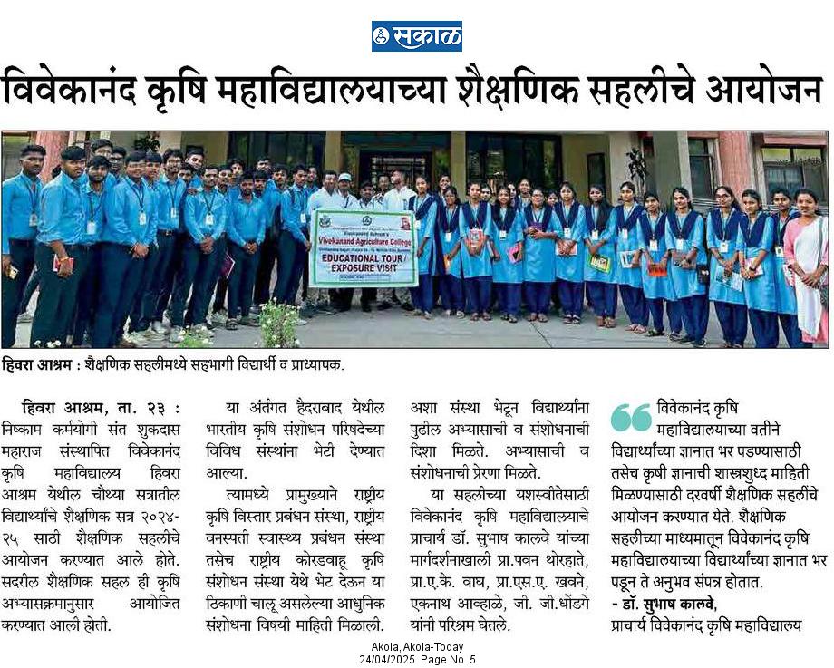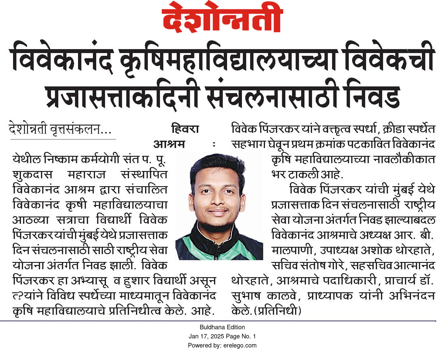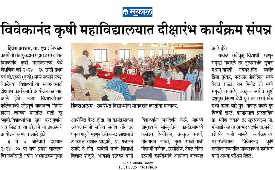 The Vivekanand Agriculture College was established in the year 2003, at the holy place of Vivekanand Ashram. The famous Vivekenand Ashram situated in the Hiwara village of the western Vidarbha district of Buldhana in Maharashtra state. On 14th of January 1965, the auspicious day of Makar Sankaranti, a visionary saint Swami Shukdas Maharaj established a charitable trust Vivekanand Ashram's in the memory of his mentor Swami Vivekananad. Shukdas Maharaj was a true social worker and reformer whose main objective was to helping the rural poor masses. Through this Trust he extended a lot of help to the poor, the sick...Read more...